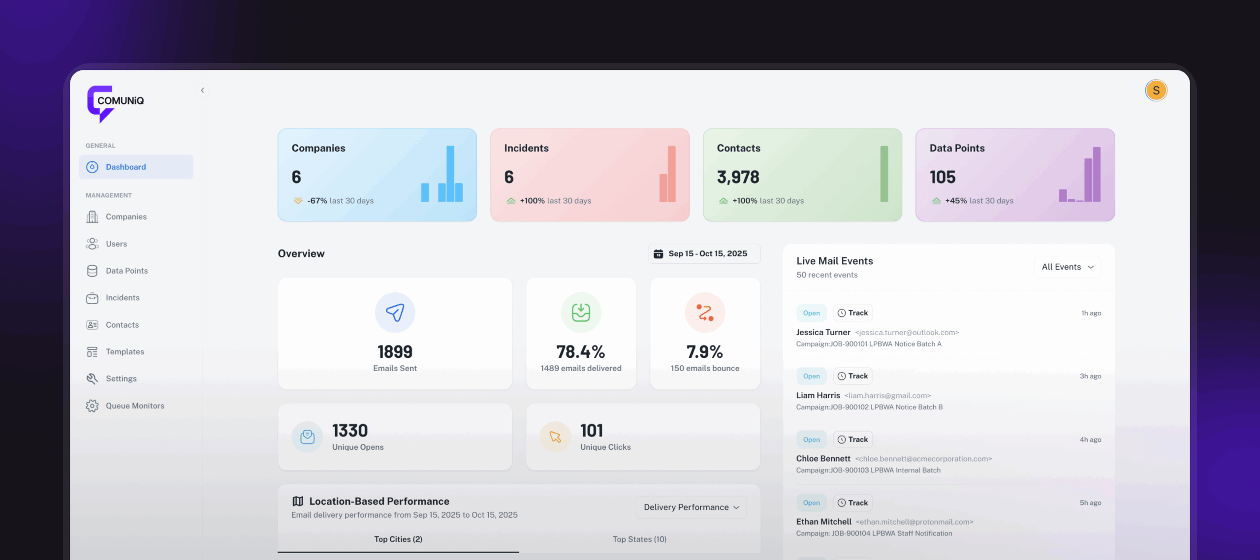 Built for incidents where every minute matters, COMUNiQ turns your Communication strategy into immediate action with full accountability across every channel.
